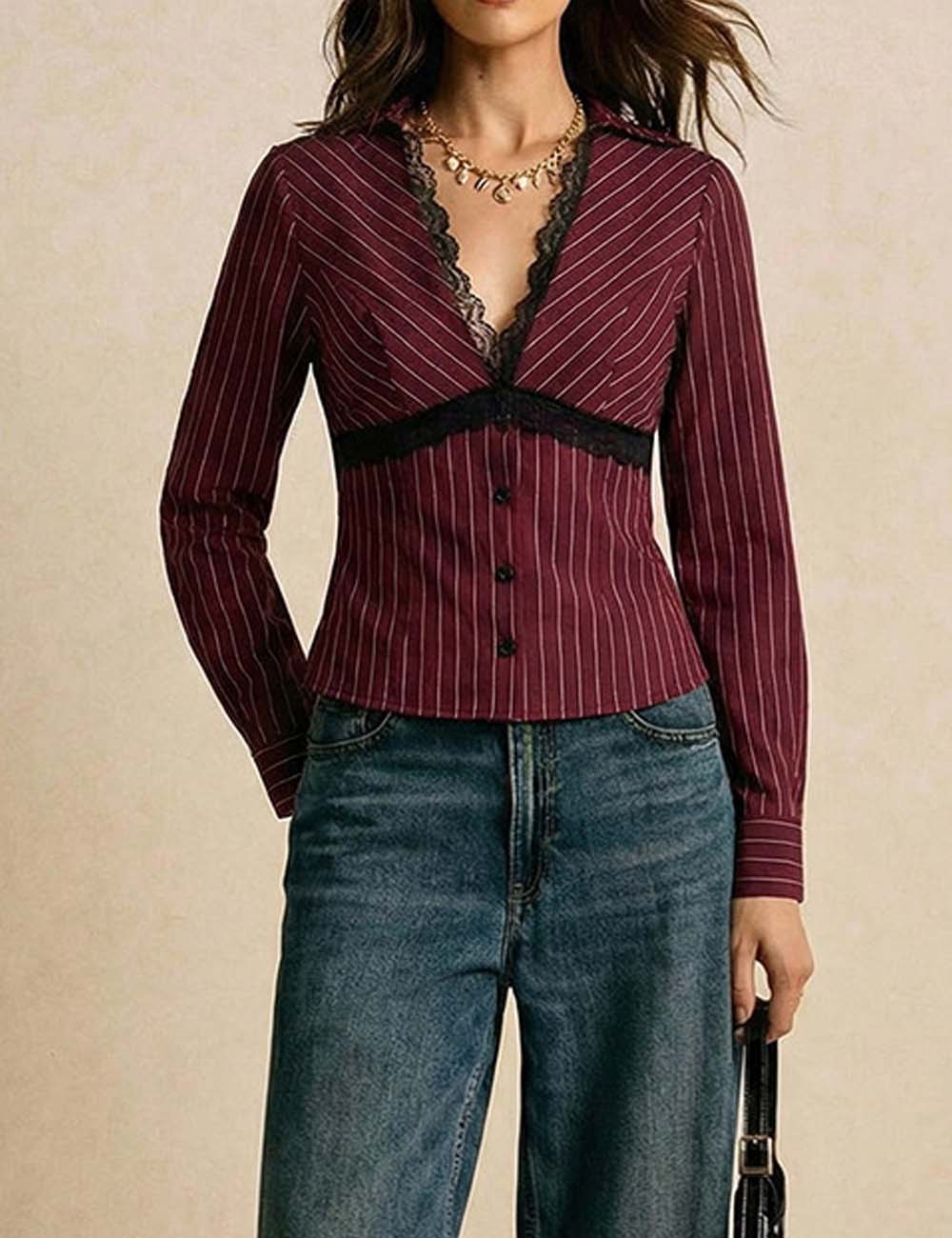 Sexy V-Neck Lace Trim Striped Slim Top DP26H828