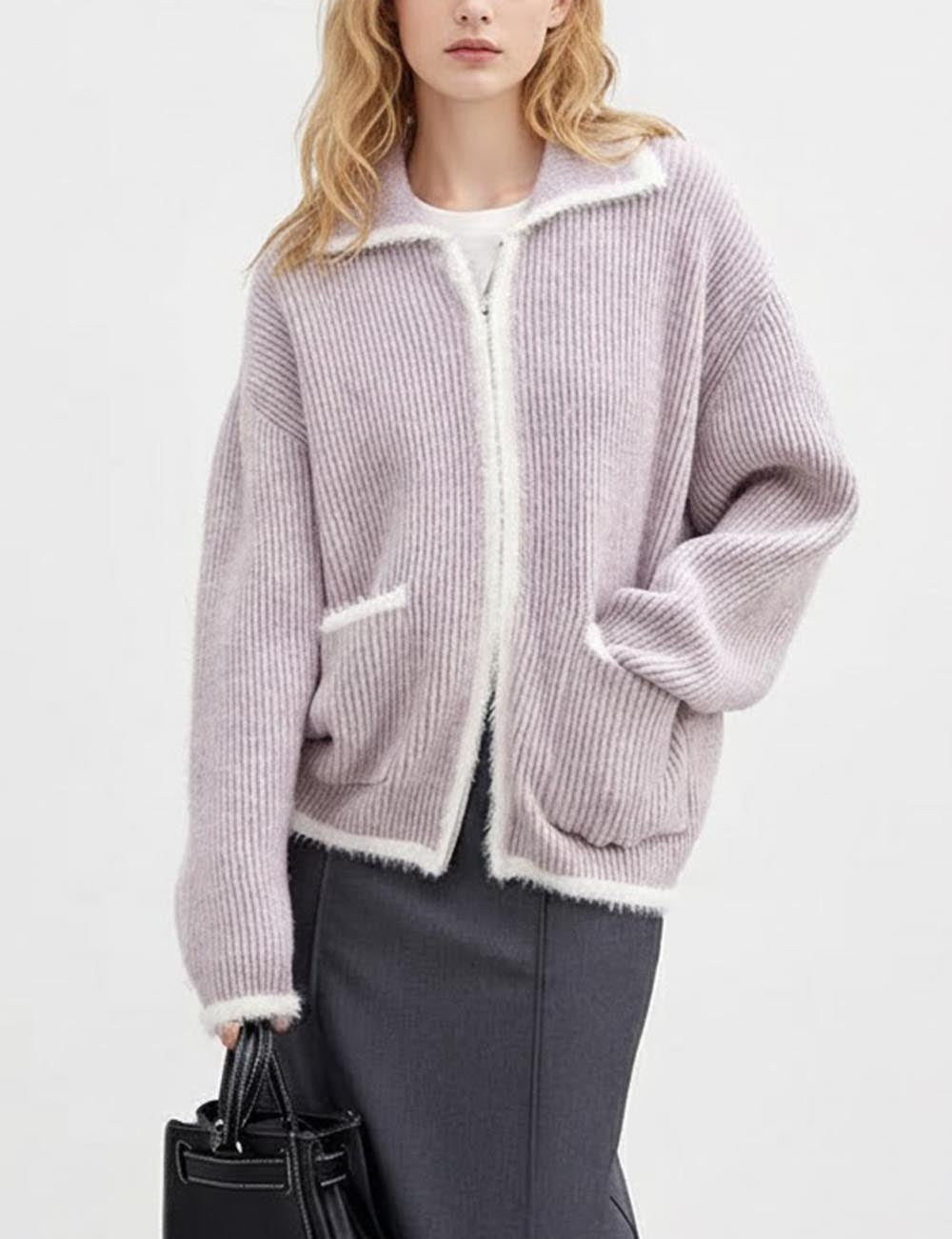Soft Color Block Zipper Lapel Pocket Knit Cardigan DP25G814