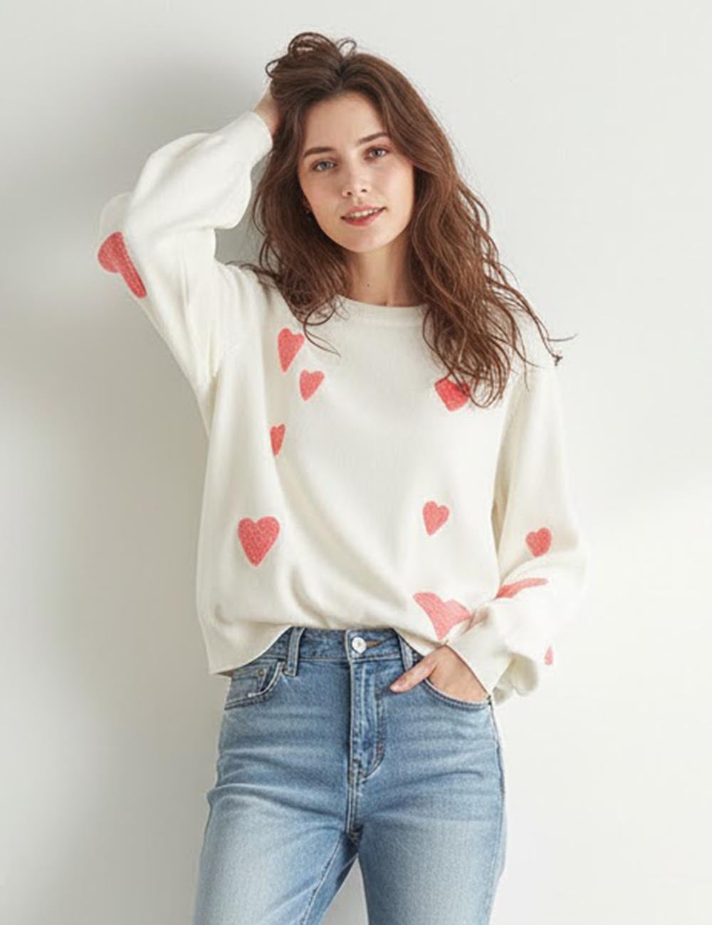 Features: * Sweet, Simple * Crew Neck * Heart Jacquard * Long Sleeve * Ribbed Knit...