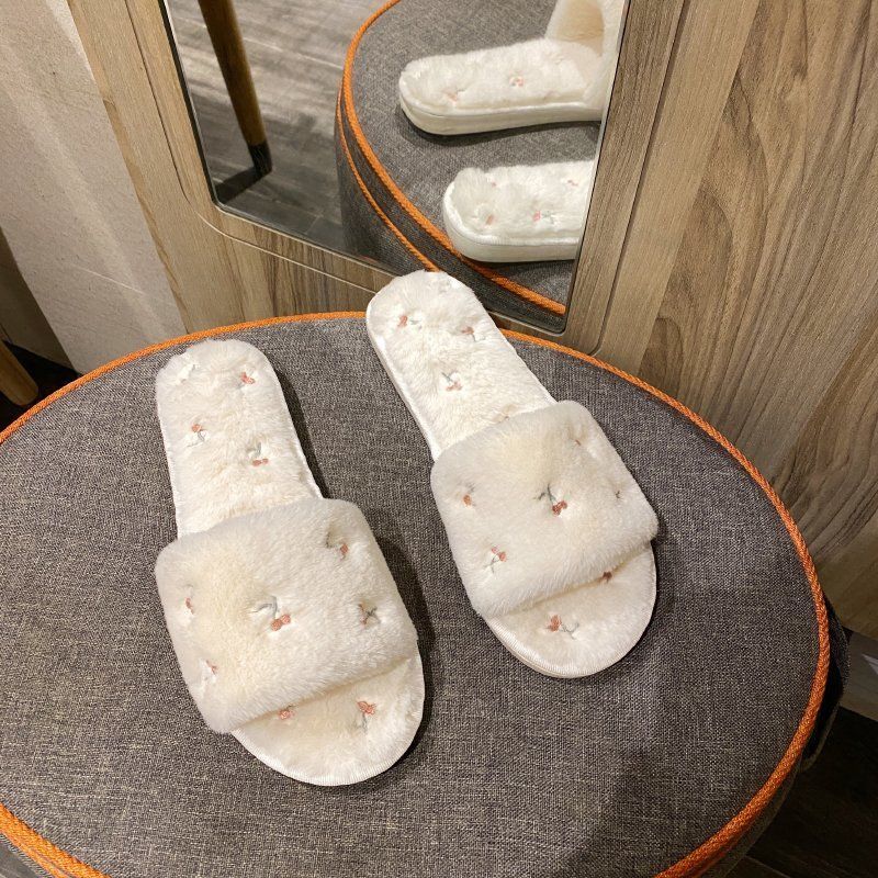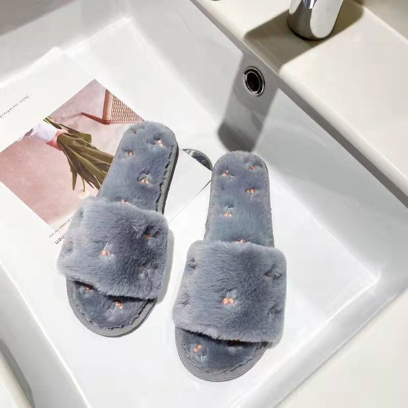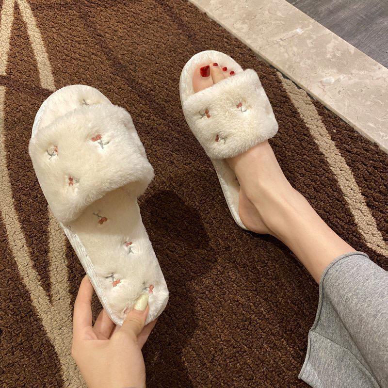 Cherry Embroidery Open Toe Plush Slippers DP25G470
