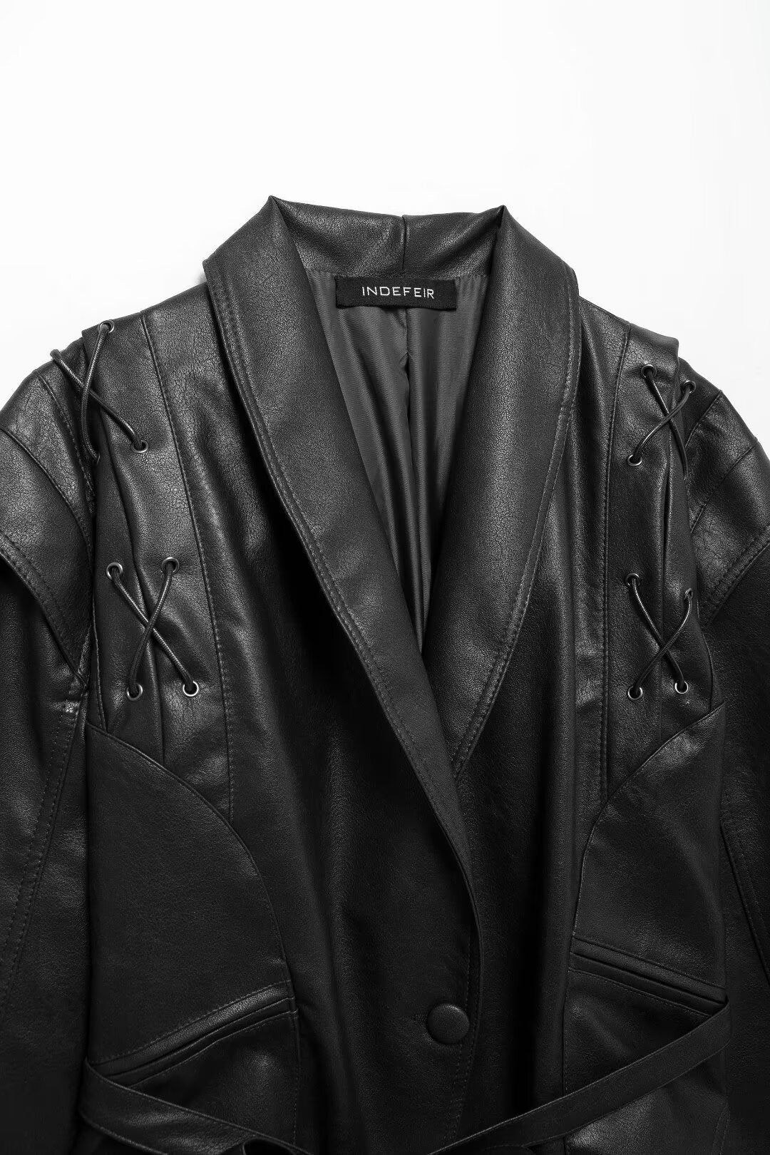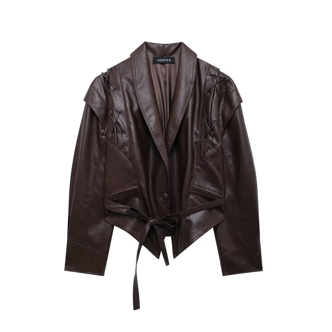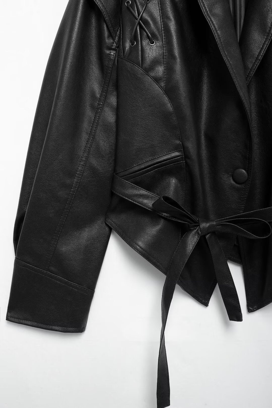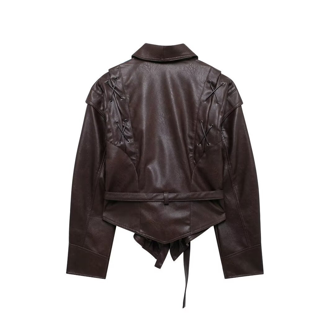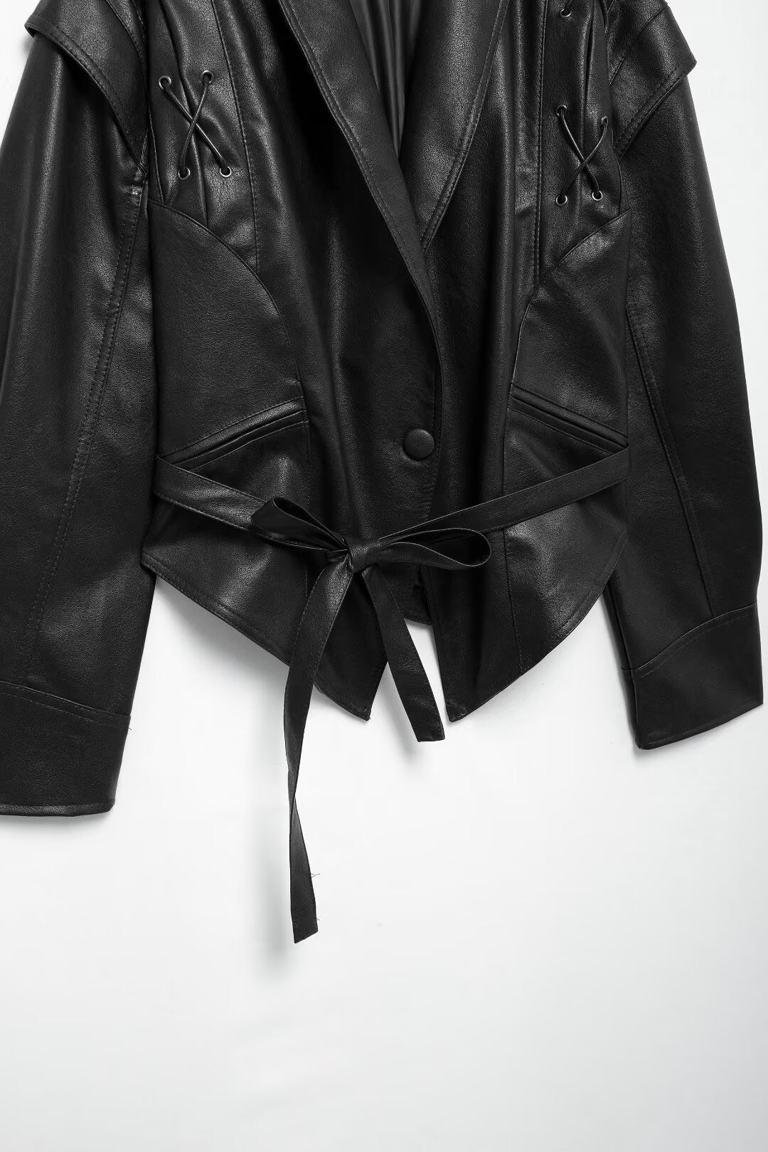 Cool Lapel Drawstring Belt Leather Jacket DP25G806